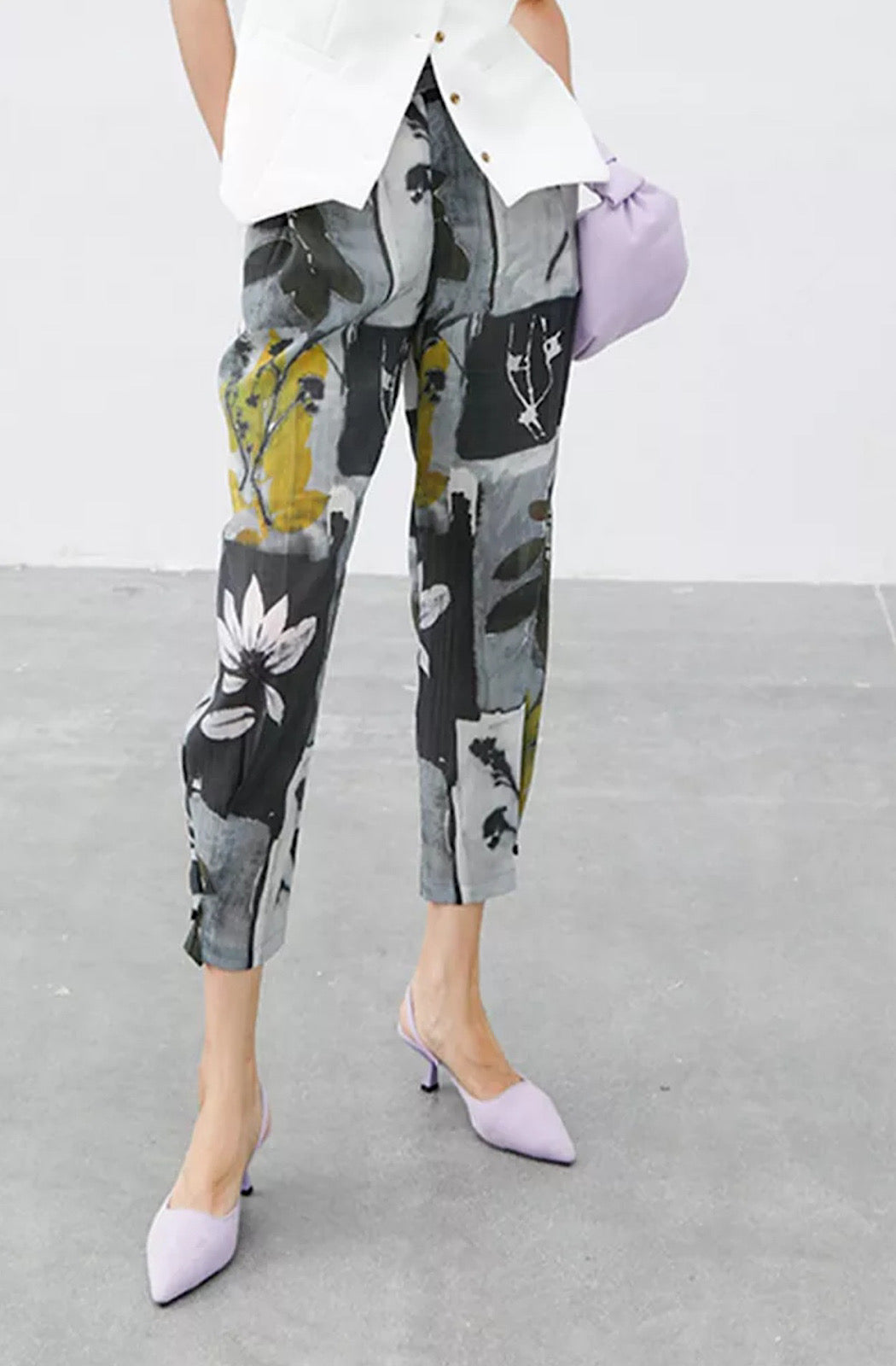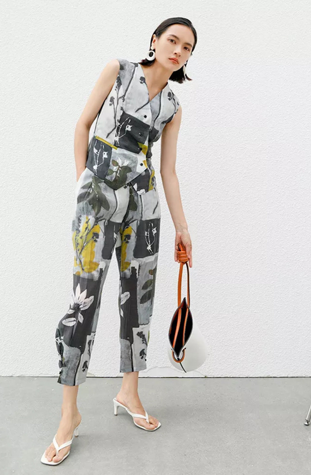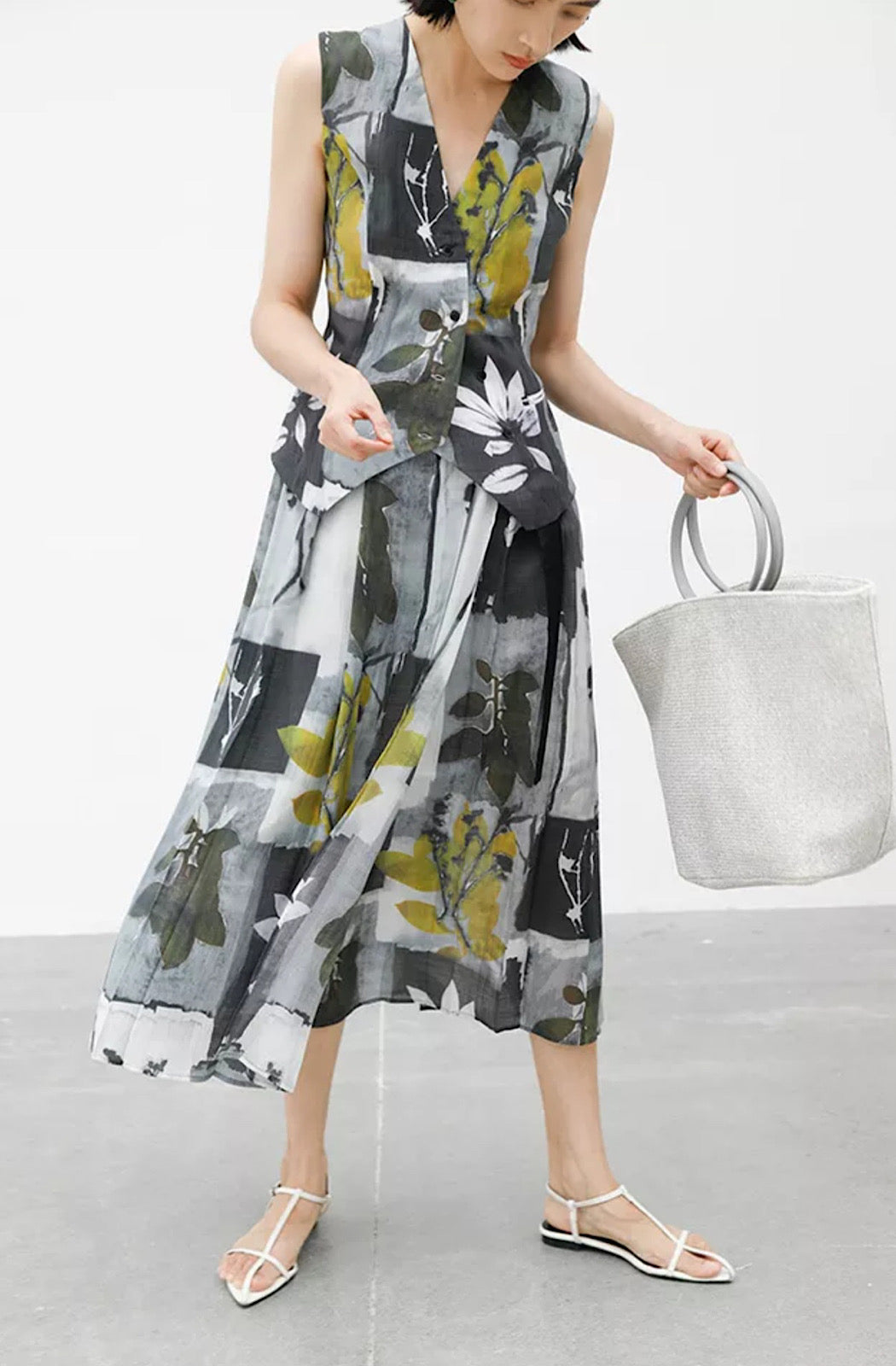 The same material is used to create the skirt, sleeveless vest and/or pants